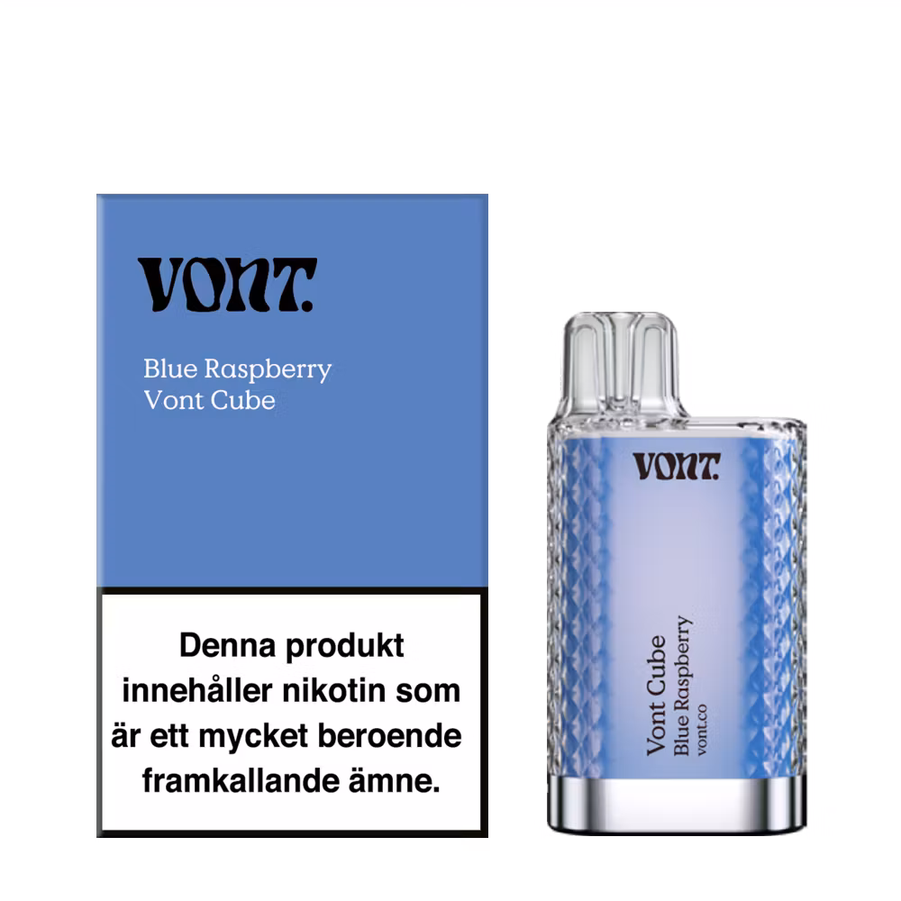 Vont Cube Blue Raspberry 20mg är en vape med med 2 ml e-vätska. Den har en smak av blåbär, björnbär och hallon. Antal puffar är upp till 800 st beroende på användning. Skillnaden från Vont To-Go är framförallt formen som liknar en liten kub.